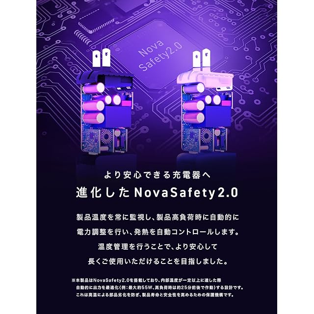 本製品は、NovaSafety 2.0に搭載された温度センサーが製品内部の温度状況を常時モニタリングし、過剰な発熱や部品の劣化リスクを抑えるため、内部温度に応じて自動的に出力電力を調整しています。ノートPCやスマートフォンなどのデバイスでは、充電開始時に高出力が必要ですが、一定時間経過後はデバイス側の電力要求が下がるため、NovaSafety2.0によっても充電速度への影響はほとんどありません。そのため、日常のご使用では充電速度の低下などの体感をいただくことはほとんどなく、安心してご利用いただけます。 一方で、電子負荷装置や工業用途など、常時65Wフルパワーで連続出力を必要とする特殊な使用環境では、安全保護機能により出力が制御される場合があります。 そのため、こうした特殊用途でのご使用には適しておりません。あらかじめご理解くださいますようお願いいたします。