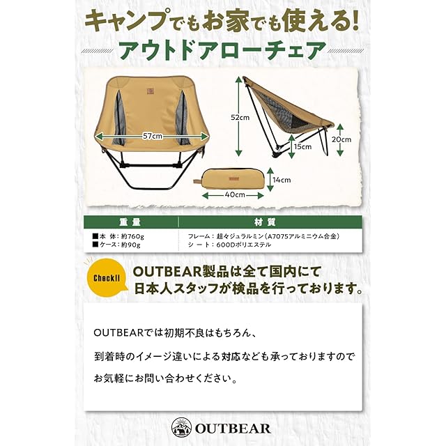 【カラーバリエーション】色は3色(ブラック・オリーブ・タン)を取り揃えており、シート生地には600Dポリエステルを採用しています。また、収納ケースを付属しています。OUTBEAR(アウトベアー)製品は日本メーカーが企画開発・検品・販売・サポートを行なっております。購入後30日間の返品返金可能です。購入後の不明点や不良など、すぐに対応します。