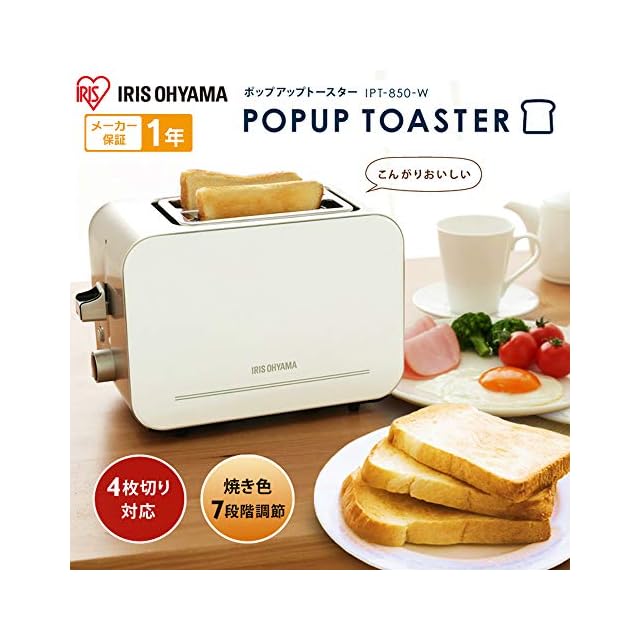 商品名:アイリスオーヤマ(IRIS OHYAMA) トースター ポップアップトースター 2枚焼き 7段階の焼き色調節 4枚切りまで対応可能 IPT-850-W ホワイト