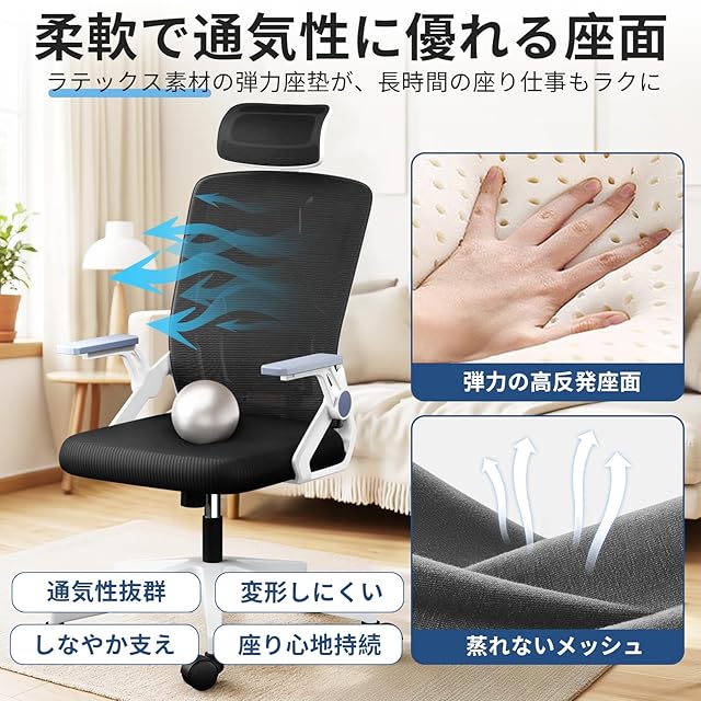 【高反発クッション・通気メッシュ生地】高反発ラテックス素材のクッションは、柔らかさと弾力性を兼ね備え、弾性坐圧分散構造により、長時間座っても疲れにくい仕様です。通気性と放熱性に優れたメッシュ素材を背もたれと座面に採用。汗や蒸れを防ぎ、快適な座り心地をキープします。夏場や暖房の効いた冬場でも蒸れずに快適な座り心地を実現します。テレワークや勉強用、オフィスワークに最適です。