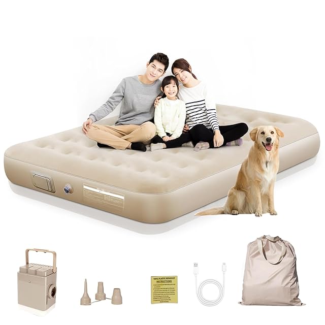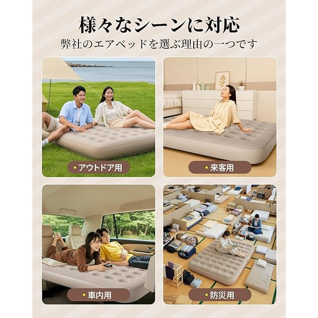 商品名:エアーベッド エアーマット 4000mAh電動ポンプ内蔵 LEDライト付き 200×150×25cm折り畳み式 自動膨張 ワンタッチで空気抜け キャンプ マット Type-C充電式 取り外し可能 簡易ベッド 防水性・通気性・快適性 収納袋付き 日本語取扱書 来客用/防災用/車中泊/引越し/家庭用/アウトドア コンパクト ダブル (ベージュ)