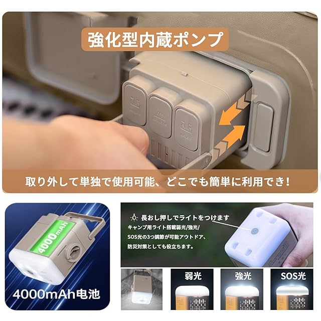 【4000mAh電動ポンプ内蔵・LEDライト付き】 こちらは大容量4000mAh電動エアポンプを内蔵したエアーベッドで、わずか2分でワンプッシュで排気および充気ができます。フル充電で4-7回が使用できる、頻繫な充電が必要ないです。お好みに合わせてエアーマットの空気量を調整することもできます。さらに、この電動ポンプは取り外して単独で使用でき、3種類のノズルが付属しており、他の用途にも適しています。内蔵されたType-C充電ポートで、充電中は赤いランプが点灯し、充電が完了すると緑のランプが点灯します。一目で分かりやすく、快適で簡単なアウトドア体験を提供します。その上、他社と異なり、本エアーマットの空気入りポンプは取り出してキャンプライト照明とや非常SOSライトして使用することができる!