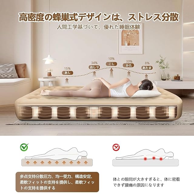 【こだわりの素材肌触り抜群 - 48孔蜂巢式デザイン】 このエアベッドは48孔蜂巢式デザインを採用し、複数のポイントでサポートを提供し、圧力を効果的に分散させ、構造の安定性を保っています。人間工学に基づいたデザインで、体の自然な曲線にぴったりフィットして、質の高い睡眠を提供します。底面には強靭なPVC素材を使用し、穿孔や変形を防ぎ、長期間使用しても耐久性を保ちます。また、底面と側面には防水機能が施されており、汚れも簡単に拭き取れ、手入れが簡単です。表面は柔らかいベロア素材を使用しており、優れた防水性と通気性を備え、快適さと実用性を兼ね備えています。