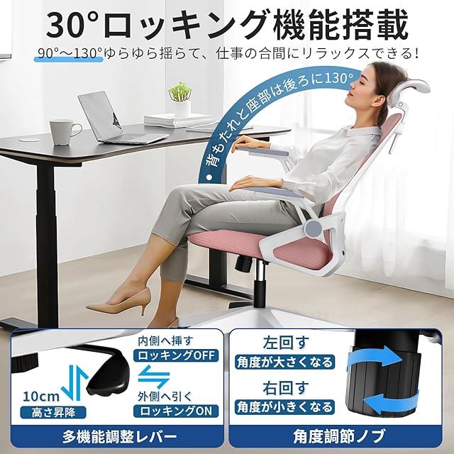 UKILIFE オフィスチェア デスクチェア 疲れない テレワークチェア ロッキング機能 人間工学 椅子 腰サポート 跳ね上げ式アームレスト 3Dヘッドレスト 高反発クッション PCチェア 通気性メッシュ ゲーミング/勉強/事務用 おしゃれ パソコンチェア (ピンク)