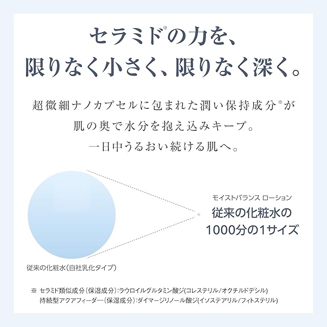 <セラミド類似成分*1>などの潤い保持成分を角層のすみずみまでたっぷりと浸透させる、業界最小レベル「超微細ナノカプセル化技術*2」を採用。 ベタつきのない使用感で、みずみずしい肌に整えます。 *1ラウロイルグルタミン酸ジ(コレステリル/オクチルドデシル) *2角層の隙間(40~60nm)よりも小さい超微細ナノカプセル(10~30nm)
