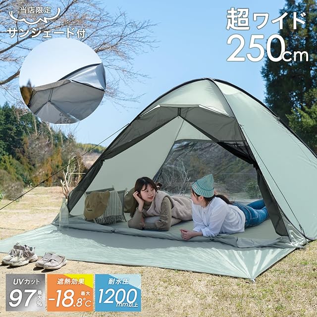 【スタッフのおすすめポイント!】<br><br>・日差しを和らげ、アウトドアをより快適に<br> ・簡単に設置が出来るポップアップ式<br> ・虫の多い季節も安心の両面メッシュ<br> ・広々使える幅250cm<br> ・急な雨にも対応!耐水圧1200mm以上<br> ・脚を伸ばしてくつろげるフロントシート付き<br> ・UV95%以上カット!シルバーコーティング<br> ・フルクローズできて透けないから着替えや授乳も<br> ・小物が入れられるメッシュポケット<br> ・テント内にはランタンをかけられるフック付き<br> ・便利な専用収納ケース<br> ・気軽に持ち運べる軽量2.8kg