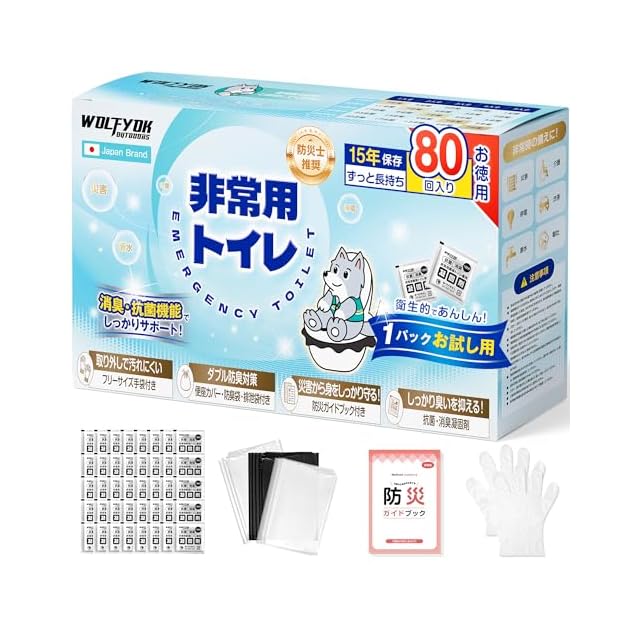 近年、日本は多くの災害に見舞われています。南海トラフ巨大地震による被害想定も最近発表されました。その度に最大の問題となるのは、災害時のトイレです。災害により断水となった場合、簡易トイレは「見えない守護者」として、下水を固め、細菌の増殖を防ぎ、避難生活における最も困難な衛生問題を解決することができます。災害時のトイレ問題を解決できますように、弊社が防災士とともに、「非常用トイレ」を開発しました。wolfyok outdoors携帯トイレは大容量凝固剤は8g入っており、約15秒で500mlの水分を固めることができます。しかも、非常用トイレは抗菌・消臭の効果があります。また、簡易トイレは厚めの排泄袋+処理袋で二重に包めた、ニオイ漏れを気にせず、周りに迷惑や不快感を与えません。簡易トイレ 災害用の凝固剤には劣化しにくいアルミ製のパッケージを採用することで長期保管を可能にしました。いつ発生するか分からない自然災害のために、日ごろの備えが必要となります。災害グッズ、防災用品、災害用トイレ、避難グッズとして備蓄をしておくと安心です。簡易トイレ、携帯トイレ、仮設トイレとしてご家庭はもちろん企業や自治体でも備蓄しておくと安心です。