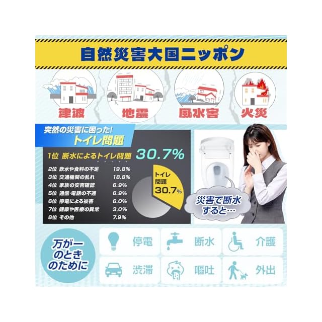 ✅【災害で水が止まった時の「縁の下の力持ち」!】阪神淡路大震災、東日本大震災、熊本地震など、近年、日本は多くの災害に見舞われています。南海トラフ巨大地震による被害想定も最近発表されました。その度に最大の問題となるのは、災害時のトイレです。災害により断水となった場合、簡易トイレは「見えない守護者」として、下水を固め、細菌の増殖を防ぎ、避難生活における最も困難な衛生問題を解決することができます。災害時のトイレ問題を解決できますように、弊社が防災士とともに、「非常用トイレ」を開発しました。