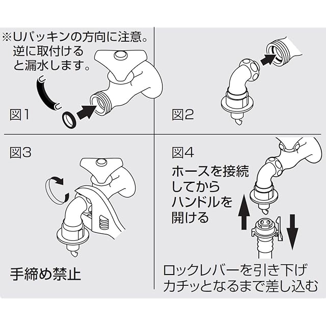 【取付方法】1.今お使いの水栓から、パイプとパッキンをはずします。2.パッキンからUパッキンをはずし、溝を水栓側に向けて、奥まで差込みます。(Uパッキンを水でぬらすと、より入りやすくなります) 3.ニップルを取付けます。リングが水栓に当たるまでまっすぐに差込みます。 4.ナットを工具でしっかりと締付けます。5.ニップルと洗濯機にホースを接続してハンドルを開けます。※取付けが不十分だとニップルが抜け、水が噴き出し財産損害発生のおそれがあります。
