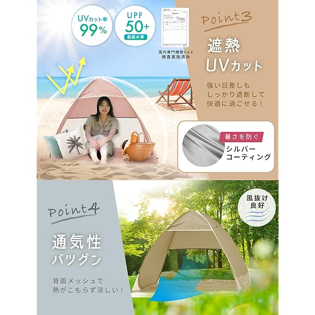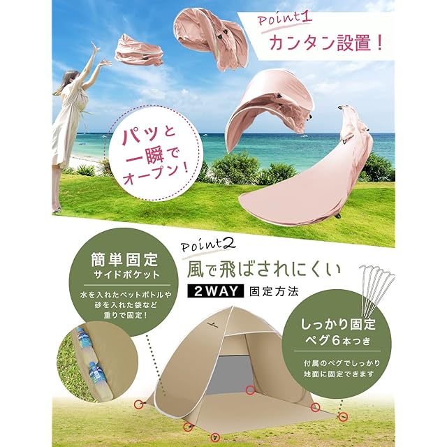 【組み立てがシンプル&スピーディー】 とことん使いやすさを追求し、テント組み立てに掛かる時間と煩わしい手順を大幅カット!専用ケースから取り出して手を放せば、5秒でぱっとテントが自動的に開きます。 また、簡易シートも本体と一体になっているのでわざわざレジャーシートなどを敷く必要がありません。