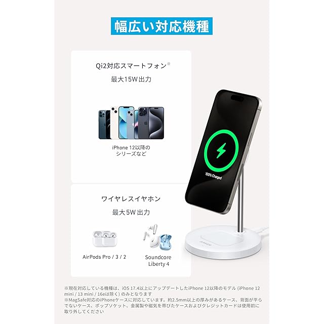 ピタッと充電、絡まずスッキリ:マグネット式ワイヤレス充電対応のスタンド型ワイヤレス充電器。Qi2対応のスマートフォン に最大15W出力でワイヤレス充電が可能です。※現在対応している機種は、iOS 17.4以上にアップデートしたiPhone 12以降のモデル(iPhone 12 mini / 13 mini / 16eは除く) のみとなります