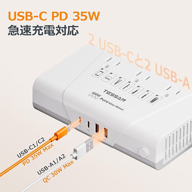 商品名:TESSAN 600W純正弦波変圧器 海外旅行用 220Vから100V 変圧器付き変換プラグ BF/O/L/B3/Cタイプ 1.2M延長コード付 PD35W QC30W急速充電 イギリス オーストラリア 韓国 ヨーロッパ イタリア インド対応