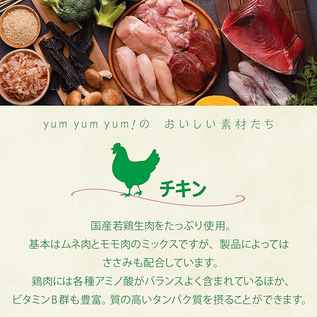 yum yum yum! は、毎日のおいしいごはんで家族のしあわせをつくる、を目指して生まれたドッグフード。愛犬の健やかな毎日のために、私たちの食事と同じレベルの品質を追求し、素材の香りを感じられるほどのおいしさにこだわってつくりました。メイン素材には国産の若鶏生肉を使用し、たっぷりのカツオ節に昆布、しいたけといった和風だしのうまみ素材を配合しています。やわらかドライはドライフードよりも水分を多く含んだしっとり食感が特長。香り高く一層おいしいごはんです。