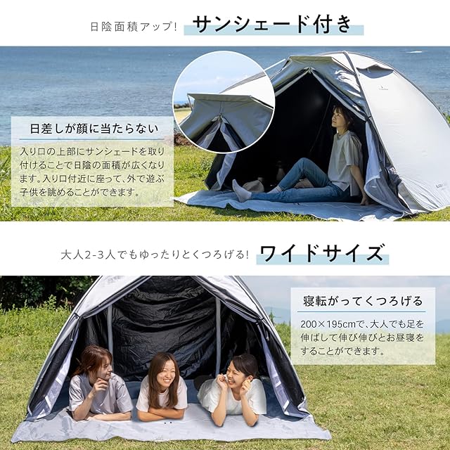 ✅【サンシェード付きで日陰面積UP】前室にサンシェードを取り付けることで、日陰の面積を大きくしました。面積が大きくなることで、入り口付近でくつろいでも日差しが顔に当たらず快適に過ごせます。