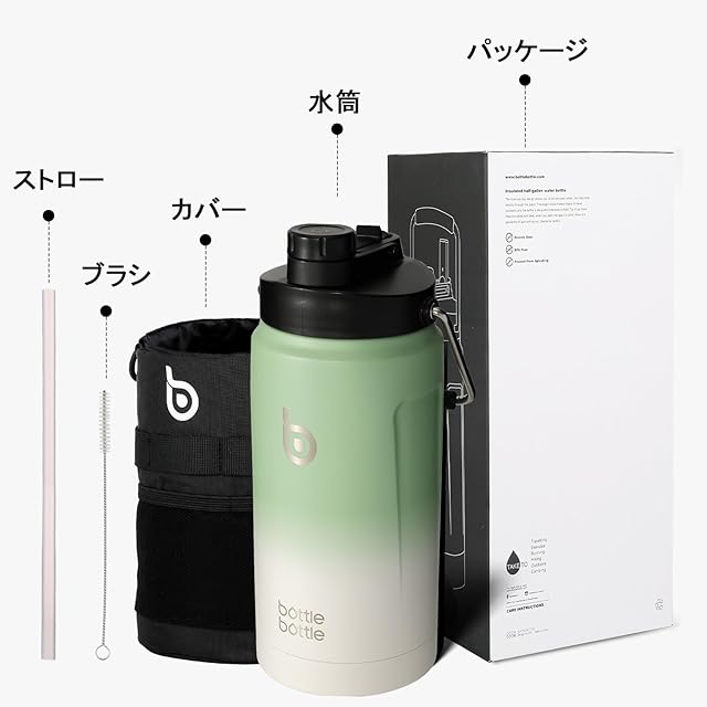 商品名:BOTTLE BOTTLE ジャグ 2000ml 水筒 2リットル 注ぎ飲み ストロー飲み 広い口径 洗いやすい 大容量 水分補給 カバー付き ステンレスボトル 保温保冷 男の子 女の子 大人 子供 部活 アウトドア スポーツ グリーン green gray