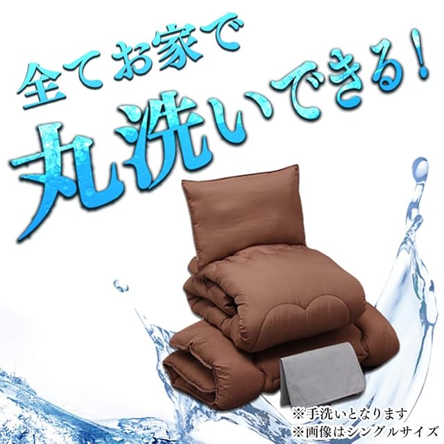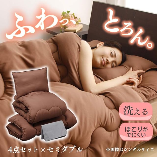 商品名:アイリスプラザ 丸ごと洗える布団4点セット セミダブル 中空ポリエステル綿採用 すっきり収納ケース付き しっとりなめらかピーチスキン加工 (掛け布団 敷布団 枕) ブラウン