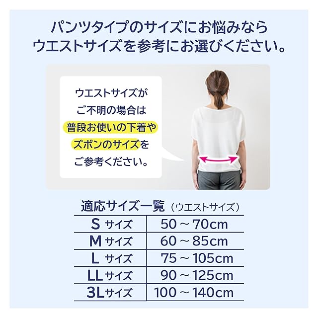 Sサイズ ウエストサイズ50〜70cm 吸収回数の目安※排尿2回分 ※1回の排尿量150mlとして(当社測定方法によるものです)