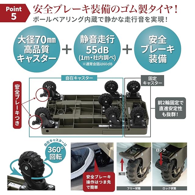 【静かで走破性の高い大型ゴムタイヤキャスター】ボールベアリング内蔵でスムースなキャスター(車輪)はこだわりの大型のゴムタイヤを採用し、優れた静音性と走破性を両立しました。段差の多い屋外でも安心してご使用いただけます。 360°回転する自在キャスターと直進性を確保する固定キャスターを最適に配置し、小回り性と直進安定性も両立させています。