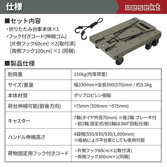 【余裕の耐荷重150kgで幅広く使用可能】宅配物や買い物品などの荷物、家具、クーラーボックス、ポリタンクなどの重い荷物も軽々と運べます。アウトドア、引越し、旅行、ショッピング、イベントなど様々なシーンで大活躍!<br><br>【折り畳んでコンパクトに収納】ハンドル部を折り畳めば天板がフラットになり平台車としても使用可能!大型の家具などを運ぶ際に便利です。 使用しない時は部屋の隙間やクローゼット、ベッドの下、車のトランクなどに簡単に収納できます。<br><br>【わずか3.3kg!軽量設計で楽々持ち運び】 女性の方でも簡単に持ち運べる軽量設計。お出かけの際も必要なときだけ使用することが可能です。イベント時の荷物の搬入出や業務における荷物の運搬にもおすすめ!<br><br>【荷台が伸縮可能で幅広の荷物も安定して運搬】荷台部分は前方向に長さを延長することができます。6+1の7輪構造を採用しており強度も高く、大型のクーラーボックスや大量の書類など、幅広の荷物を運搬する際も安定して移動可能です。<br><br>【静かで走破性の高い大型ゴムタイヤキャスター】ボールベアリング内蔵でスムースなキャスター(車輪)はこだわりの大型のゴムタイヤを採用し、優れた静音性と走破性を両立しました。段差の多い屋外でも安心してご使用いただけます。 360°回転する自在キャスターと直進性を確保する固定キャスターを最適に配置し、小回り性と直進安定性も両立させています。<br><br>【牽引モード・手押しモード切替可能】ハンドル部は130°まで倒すことが可能で、悪路や重量物でも安定して引っ張れる「牽引モード」、手軽に押せる「手押しモード」を状況に応じて使い分けることが可能です。【荷物固定用コードを付属】片側フックコード×2本[本体取付済]+両側フックコード×1本[製品同梱] 計3本の伸縮ゴムコードを付属させており、あらゆるサイズの荷物をしっかり台車に固定することができます。荷物の落下を防止して安全な運搬が可能です。