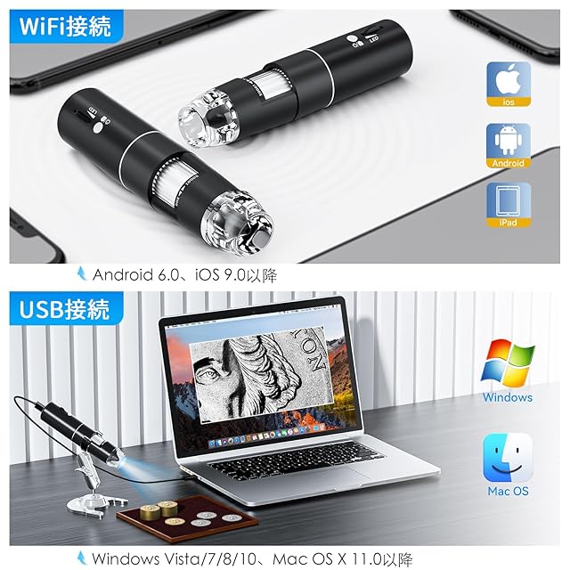 【強大な互換性】 IOS9.0 & Android6.0以降の携帯電話、コンピュータシステムのWindows vista/7/8/10、MacOS11.0に適用します。静止画&動画撮影が可能です、操作が簡単で、旅行に持っていって、子供たちが植物、鉱物、昆虫を研究したり、楽しい野外活動をしたりできます。この電子顕微鏡は、従来の顕微鏡ではなく、固定焦点の拡大鏡に近いものです。プロの真剣な生物学者には適していません