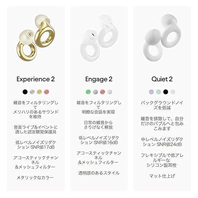 音楽ライブやイベントにハイファイ聴覚保護が必要ですか?Loop Experience 2は、再利用可能なノイズリダクション耳栓。コンサート、フェス、ライブエンタメ、スポーツイベント、音楽活動などに最適です。スマート設計のアコースティックチャンネルとメッシュフィルターを備えたExperience 2。ギグやライブイベントで鮮明かつクリアな音質を保ちつつ、17 dB(SNR値)のフィルターノイズリダクションがより安全で快適な音量を維持します。ハイファイ耳栓、Experience 2は再利用可能で耐久性に優れ、長持ちします。 認定聴覚保護具を装着して騒音によるダメージから耳を守り、安心してパーティーやコンサートに出かけましょう。音質を損なうことなく聴覚を保護するように設計されたExperience 2耳栓は、聴覚だけでなく総合的に健康をサポートします。耳を保護してフェスに参加し、周りの騒音を気にすることなくスポーツイベントをお楽しみください。最高の自分でイベントに臨みましょう。 再利用可能でお手入れ簡単。耐久性に優れたこの長持ちするハイファイ耳栓には、交換可能なイヤーチップが付属。大きな耳にも小さな耳にもカスタマイズされたフィット感を提供します。サイズはXS、S、M、Lの4種類。耳栓に付属の携帯用キーホルダー型Carry Caseで夜間の外出や外出先で耳栓を安全に持ち運べます。Loop Experience 2は、パーティスタイルを引き立てる大胆なメタリック4色での展開。この再利用可能な耳栓がフェス、コンサート、スポーツイベントなどでパッシブ聴覚保護具として騒音から耳を守ってくれます。