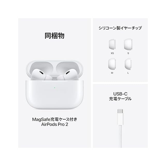 商品名:Apple AirPods Pro 2 アクティブノイズキャンセリング、ワイヤレスイヤホン、Bluetooth5.3、外部音取り込み、パーソナライズされた空間オーディオ、原音に忠実なサウンド、H2 チップ、USB-C 充電、防塵性能と耐汗耐水性能、「探す」対応、Qi充電、ヒアリング補助機能