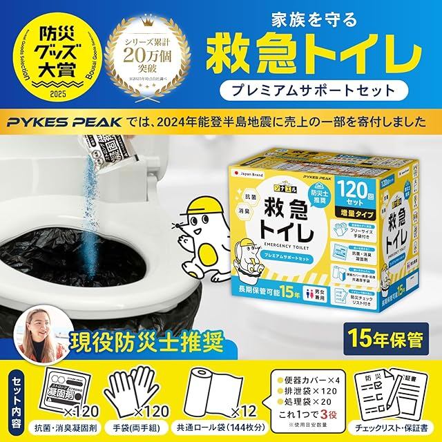 【防災士推奨】PYKES PEAK 救急トイレ 簡易トイレ 120回セット 凝固剤×120 共通袋×144 手袋×120 災害トイレ 15年保存 携帯トイレ 防災グッズ 災害用 非常用 防災チェックリスト付き モグラ隊長