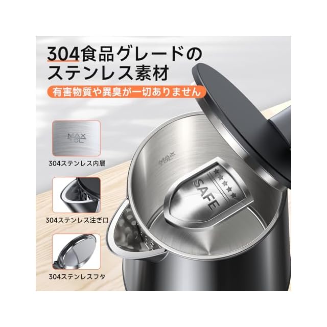 健康で安心!二重構造ケトル:本電気ケトル内層は食品グレードの304ステンレススチール製で、防錆性と耐食性があり、匂い移りが少なく無臭無味の熱湯が用意できて、水との健康的な接触を保ちます。外層は食品用PP素材、金属と比較すると表面に温度が伝わりにくく、やけどのリスクを低減可能。(安全水位ライン:MIN0.5L、MAX1.0L)