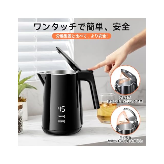 急速沸騰、安全性も抜群:忙しい朝に!すぐ飲みたいときに満水時(1.0L)が約5分で沸騰する。ガスや火を使わずにお湯を沸かせるうえ、空焚き防止機能も付いているので、安全性も抜群。ワンタッチボタンで蓋が開き、熱気でやけどする心配はありません。2段階の開口角度調整ができる蓋で、手を簡単に入れて掃除することができます。沸騰までのスピーディさ・使いやすさ・安全性、すべて妥協できない人におすすめです。