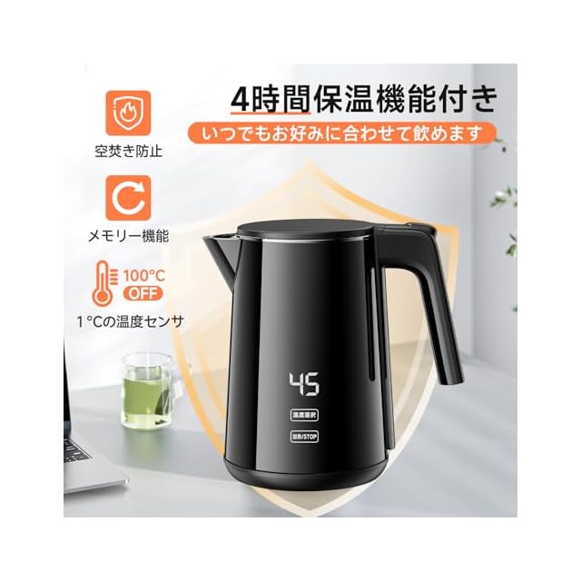 高機能節電「電気ケトル」:LEDボディデジタルディスプレイ ケトル、温度が本体に直接表示されるので現在温度と設定温度を一目で確認できる。7段階の温度設定、4時間保温機能、急速沸騰、空焚き防止機能、メモリー機能、触れても熱くない二重構造デザイン、安全でお手入れが簡単なステンレス製で、個人のニーズに完璧にお応えます。母の日、父の日、敬老の日、結婚祝い、新築引っ越し祝いなどのプレゼントとして最適です。
