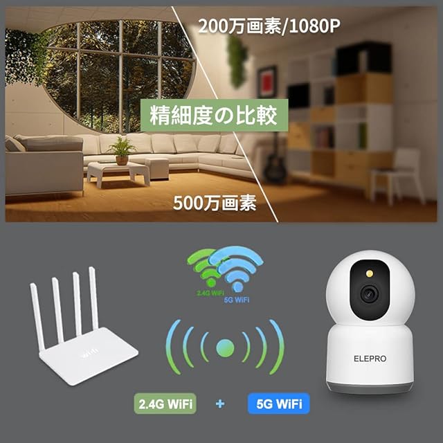 商品名:【500万画素・2.4と5G WiFi対応】ELEPRO ペットカメラ 見守りカメラ (1080Pや400万画素より鮮明 2.4Gよりスムーズ カラーナイトビジョン PTZ 自動追尾 スマホで見れる 動体検知 プッシュ通知 音声やライト警告)防犯カメラ セキュリティカメラ 監視カメラ ベビーモニター ベビーカメラ 室内用ネットワークカメラ 玄関カメラ ワイヤレスカメラ ホームカメラ