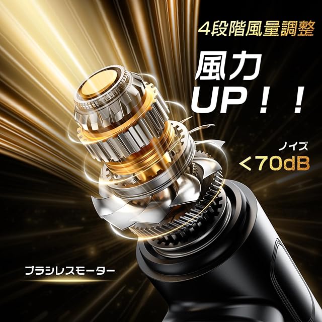 ご注意:新グレードではノズルやブラシ、収納袋を多数装備しましたので、追加購入も可能です。あまり暑い環境でのご使用にはご注意ください。発熱時は使用を一時停止した方が良いです。【風速150m/s&300,000RPM】日本業界初のダブルタービンファンで風量2倍!ブロワーはブラシレスモーターを採用し、ノイズは以前より低くなった、空気の運動エネルギーを大幅にUP!強力で効率的なエアフローを実現します。風速が弱いという問題点を解決しました。瞬間的に強い風をピンポイントで送れてホコリを吹き飛ばします。耐久性が大幅に向上するだけでなく、消費電力も30%削減できます!