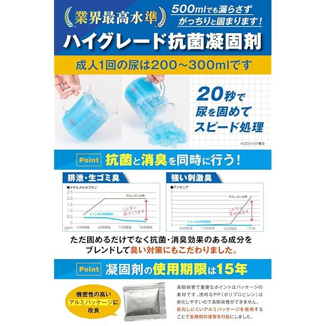 ✅【15年保管 ハイグレード抗菌凝固剤】 凝固剤で、菌の増加による嫌な匂いをしっかり抑えることができます。アンモニアだけでなく、糞尿に多く含まれるメチルメルカプタンによる臭いにも消臭効果を発揮します。 500mlもの水分が素早く固まり安心です。また、劣化しにくいアルミ製のパッケージにより、長期保管を可能にしました。