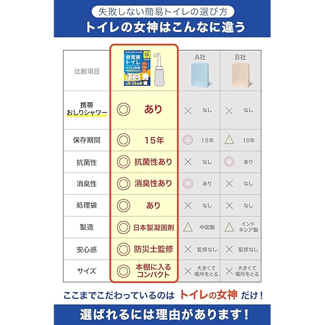 商品名:どこでも簡単トイレ トイレの女神PREMIUM 簡易トイレ 【単身/2人世帯向けに防災士が監修】50回分 15年保存&日本製 携帯トイレ 防災トイレ 非常用トイレ 防災グッズ 防災 携帯おしりシャワー付き