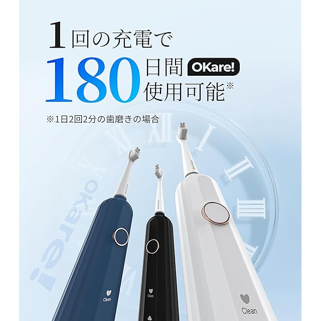 【180日間使用可能 ・充電リマインダー ・メモリー機能】充電式電動歯ブラシは大容量2200mAhバッテリーを搭載し、Type-Cで1回の充電で180日間(半年)電動はぶらしを使用可能です。バッテリーが切れそうな時にはお知らせ可能、前回使用したブラッシングモードを記憶する機能が付きます。