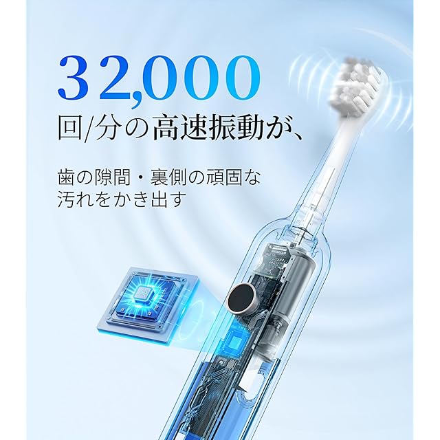 【抜群な高速音波技術採用 ・静音設計 ・IPX7防水】デュポン社製の極細毛ブラシを採用し、『ハイテク磁気浮上式モーター』を搭載し、高速音波振動と振幅でし歯垢をかき出して、歯間や歯ぐきの汚れをやさしく落とします。55dBの低ノイズ設計で、IPX7防水性能も持っており、シャワー中やお風呂でも安心してご使用可能な音波振動歯ブラシです。