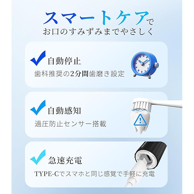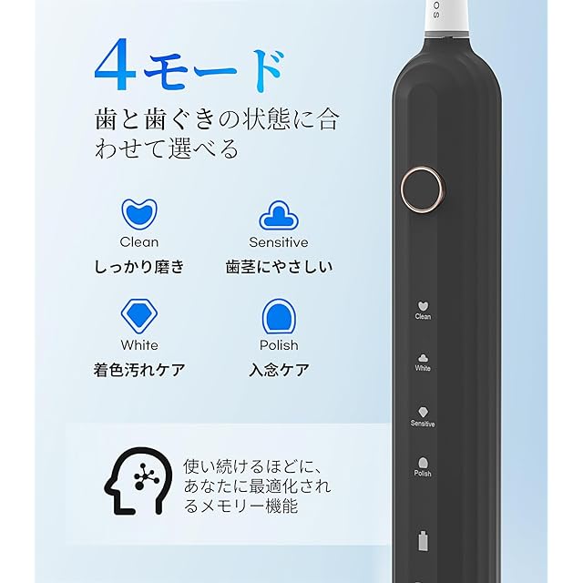 【4つのブラッシングモード ・2分間スマートタイマー ・ 過圧防止センサー機能】音波歯ブラシは4段階の切替モード(クリーニング/センシティブ/ホワイト/ポリッシング)で振動速度を変え、「2分間」で自動停止機能付き(ホワイトモードでは2分30秒で自動停止)、電動歯ブラシにかけられた圧力が大きすぎると、自動的に振動を低減し、歯と歯茎を強すぎる刺激から守ります。