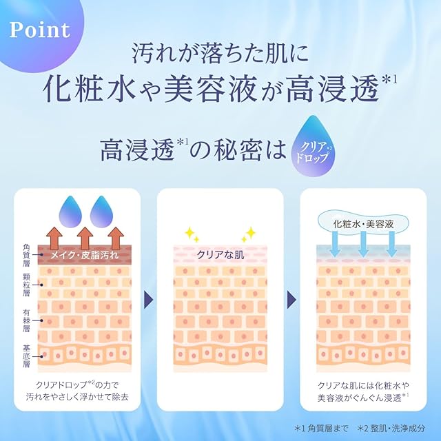 【毛穴ケア*¹に着目したクレンジングジェル】高機能還元水「クリアドロップ*²」をベースに使用。肌との親和性が高く、メイクを浮かび上がらせやすくします。毛穴に蓄積した汚れや黒ずみ*³をこすらず吸着除去し、透明感*⁴のある素肌へ導きます。 *1毛穴の汚れを落とすこと*2整肌洗浄作用*3汚れや古い角質による*4洗浄効果による