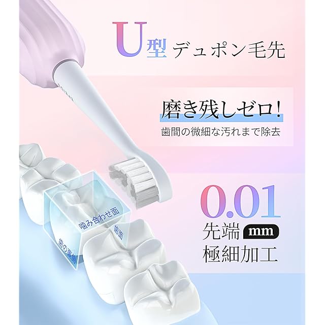 【抜群な高速音波技術採用 ・静音設計 ・IPX7防水】デュポン社製の極細毛ブラシを採用し、『ハイテク磁気浮上式モーター』を搭載し、高速音波振動と振幅でし歯垢をかき出して、歯間や歯ぐきの汚れをやさしく落とします。55dBの低ノイズ設計で、IPX7防水性能も持っており、シャワー中やお風呂でも安心してご使用可能な音波振動歯ブラシです。