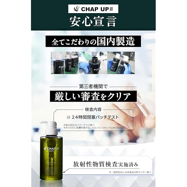 5種類の高級アミノ酸系・植物系洗浄剤使用。オーガニックエキス10種配合の弱酸性で頭皮の潤いそのままキープ。濃密で、心地よい洗い上がり。毛髪診断士による開発・監修。無添加・天然成分にこだわり、洗髪するたびに健康な頭皮環境を保ちます。 【使用方法】1プッシュ分のシャンプーを手のひら、もしくは後頭部から側部でよく泡立てます。泡が頭皮全体をしっかりと包み込むまで1プッシュずつ追加し、泡立てていきます(使用量は髪の毛の長さによって異なります)。 ※チャップアップシャンプーには髪の毛に良い成分がギュッと濃密に詰まっているため普通のシャンプーに比べ、粘度が高くなっています。このためポンプ部分が重く戻りづらいとお感じになる場合もございますが不良品ではございませんのでご了承くださいませ。