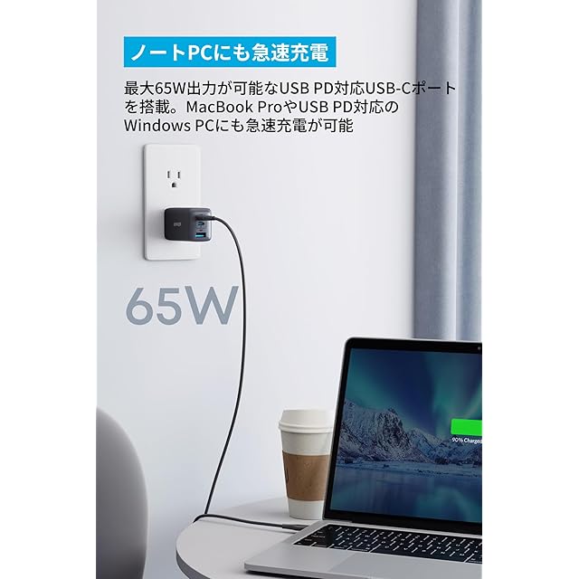 3台同時に充電可能:スマートフォン、タブレット、MacBook、USB PD対応のWindowsノートPCなど、多種多様なデバイスを一度に充電可能。PowerIQ 3.0 (Gen 2) を 搭載した2つのUSB-CポーとAnker独自技術PowerIQ搭載のUSB-Aポートを備えています。3ポート利用時の合計最大出力は65Wと高出力。機器毎に異なる充電器を持ち運ぶ必要はありません。※3ポート利用時の合計最大出力は64W