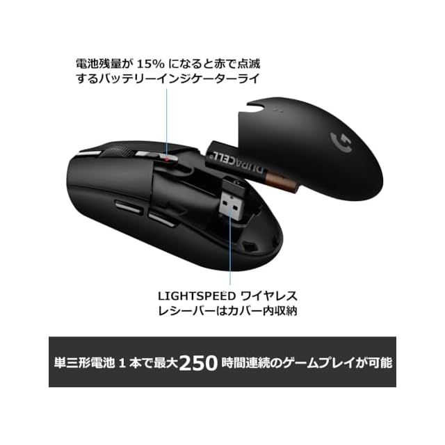 商品名:Logicool G ゲーミングマウス G304 LIGHTSPEED ワイヤレス ゲーミング マウス 軽量 99g HERO 12Kセンサー 6個プログラムボタン 250時間連続使用可能 ブラック PC windows mac 国内正規品 【 ファイナルファンタジー XIV 推奨モデル 】
