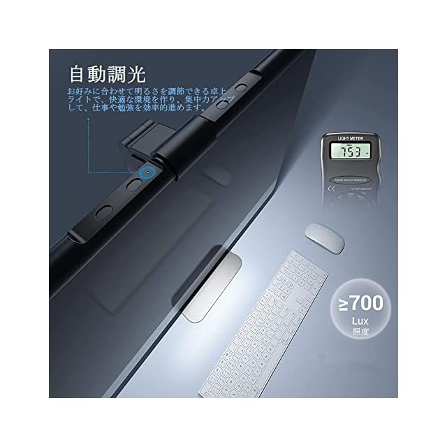 自動調光機能・自然光に近い色を再現: Quntisモニターライトはパソコンのディスプレイに引っ掛けて設置するだけで、手元を明るくすることができる。電源を入れ、無段階輝度調整ボタンをタッチすると、周囲の明るさを検知して自動で光量を調整する自動調光モードになる。照明の明るさを自分の好みや環境に合わせて変更でき、眼の負担を軽減し、快適な視聴環境を提供することができます。*光センサーライトを遮らないでください。