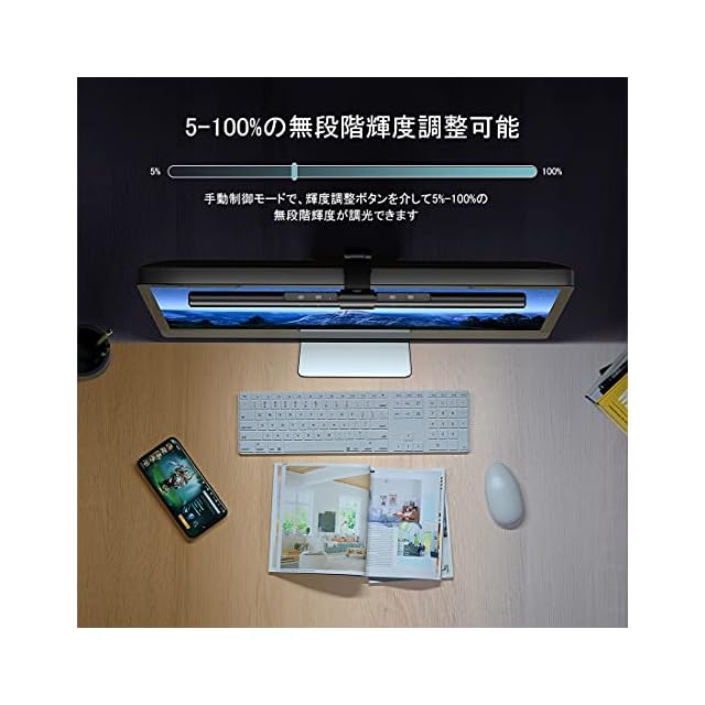 ムード照明: 手動制御モードでは、バーライトの輝度と色温度をボタンで調整し、無段階輝度は5%から100%、色温度は3000Kから6500Kまで変更できる。高演色性(Ra95)で色の再現性が向上しており、細かな色の違いも見やすく、対象物がクリアに見え、目が疲れにくい明かり。集中力と快適さを向上させ、仕事や勉強を効率的に進めることができる。PC作業、残業、寝室、卓上、読書、譜面台、ピアノ、デスクトップに最適。*適合するモニターの厚さは0.7cm~3.5cmですので、ご参考にしてください。