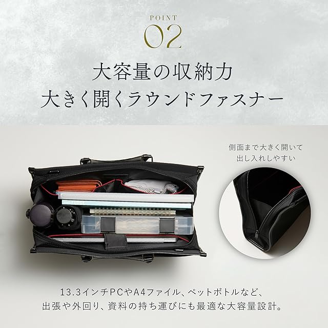 ✅ 3. ノートPCも安心収納(13.3インチ対応) 専用のPCポケットがあり、13.3インチまでのノートパソコンをしっかり収納。資料やファイルもすっきり収まり、面接・出張・外出時にも安心です。