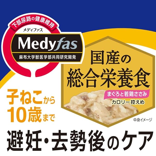 商品名:メディファス 避妊・去勢後のケア 子ねこから10歳まで チキン&フィッシュ味ドライ150g&まぐろと若鶏ささみウェット50g×6個 【総合栄養食/下部尿路/国産】【メール便】