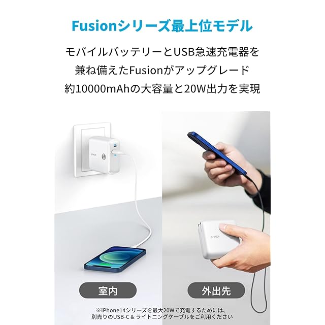 <br> Anker PowerCore Fusion 10000<br> <br>モバイルバッテリー搭載USB充電器 Fusionのフラグシップモデル <br><br><br> 製品の仕様<br> <br>サイズ:約82 × 82 × 35mm <br>重さ:約278g <br>入力:100-240V 0.7A 50 - 60Hz <br>USB-A 出力:5V=2.4A <br>USB-C 出力:5V=3A / 9V=2.22A <br>合計最大出力: <br>・20W (USB-Cポート単体充電時) <br>・15W (2ポート同時充電時) <br>容量:9700mAh <br><br><br> 容量・出力ともに進化したFusion<br> <br>モバイルバッテリーとUSB急速充電器を兼ね備えたFusionが、利便性を更に高めてアップグレード。約10000mAhの大容量と20Wの高出力を実現しました。 <br><br><br> iPhone 12にも急速充電<br> <br>最大20W出力で、iPhone 12シリーズを最速で充電可能です。一般的な5W出力の充電器に比べ、最大3倍速く充電できます。(※iPhone 12を0%から30分充電した場合との比較) <br><br><br> 幅広い対応機種<br> <br>Power IQ 3.0 (Gen2)に対応した最大20Wの出力が可能なUSB-CポートとUSB-Aポートを搭載し、iPhoneやGalaxy、Pixel等のスマートフォンだけでなく、タブレット端末やAirPods等の機器にもフルスピード充電が可能です。 <br><br><br> 安心の大容量<br> <br>約10000mAhの大容量で、iPhone 12 を2回以上、Galaxy S20を約2回、Pixel 5を1回以上満充電することができます。外出先でもより長時間お使いいただけるようになりました。 <br><br><br> PowerIQ 3.0 (Gen2)<br> <br>Anker独自技術PowerIQ 3.0 (Gen2)を搭載。USB Power Deliveryとの互換性をさらに高めながら、Qualcomm Quick Chargeなどの充電規格にも対応し、より幅広い機器への急速充電に対応しました。 <br><br><br> 高い安全性<br> <br>難燃性素材や温度管理機能などAnker独自の多重保護システムによりあなたとお使いの機器を守ります。 <br><br><br> 対応機種<br> <br>スマートフォン <br>- iPhone 12 / 12 mini / 12 Pro / 12 Pro Max / 11 / 11 Pro / 11 Pro Max / SE(第2世代) / XS / XS Max / XR / X / 8 / 8 Plus 他 <br>- Galaxy S20 / S20+ / S20 Ultra / S10e / Note10 / Note10+ / S9 / S9+ / S8 / S8+ / Note 8 / Note 7 他 <br>- Pixel 5 / 4 / 4a / 4 XL / 3 / 3 XL 他 <br>- Nexus 6P / 7 他 <br>タブレット端末 <br>- iPad (第8世代) / iPad Air (第4世代) / iPad Pro (第4世代) / iPad mini (第5世代) 他 <br>その他対応機種 <br>- AirPods / AirPods Pro / Apple Watch 他<br><br><br> ご注意<br> <br>・USB-Cポートは出力専用です。入力用としてご使用しないでください。本体充電時はコンセントをご使用ください。 <br>・イヤホンやスマートウォッチ等の入力電流が低い製品には「低電流モード」をご利用いただけます。モバイルバッテリーとしてUSB-Aポートをご使用時は電源ボタンを2回押す、または2秒間押し続けると本モードへ切り替わり、LEDライトが緑色に点灯します。 <br>・iPhone12シリーズを最大20Wで充電するためには、別売りのUSB-C & ライトニングケーブルをご利用ください。 <br>・プラグ部分にほこりなどの異物が付着している場合、火災などの事故につながる可能性がございますのでご注意ください。 <br>・本製品はGalaxy S20やNote10に対応していますが、付属の充電器より充電スピードは低下します。