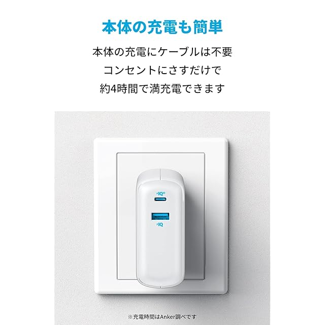本体の充電も簡単:本体の充電にケーブルは不要です。コンセントにさすだけで約4時間で満充電できます。(※充電時間はAnker調べです)