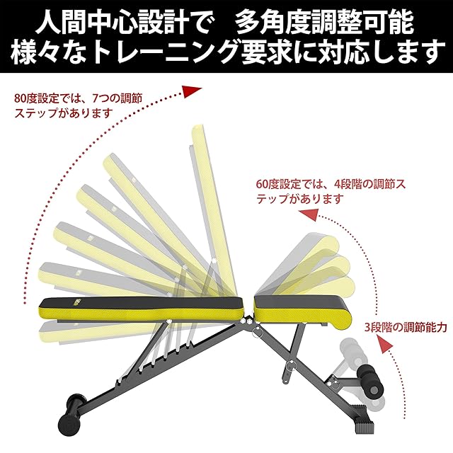 【日本企業】トレーニングベンチ インクラインベンチ ダンベル ベンチ 角度調節 組立超簡単 折り畳み式 収納便利 フラットベンチ マルチシットアップベンチ 腹筋 背筋 シットアップ 耐荷重300KG 筋トレ 家庭用 日本語説明書【メーカー:2年間】 (イエロー)