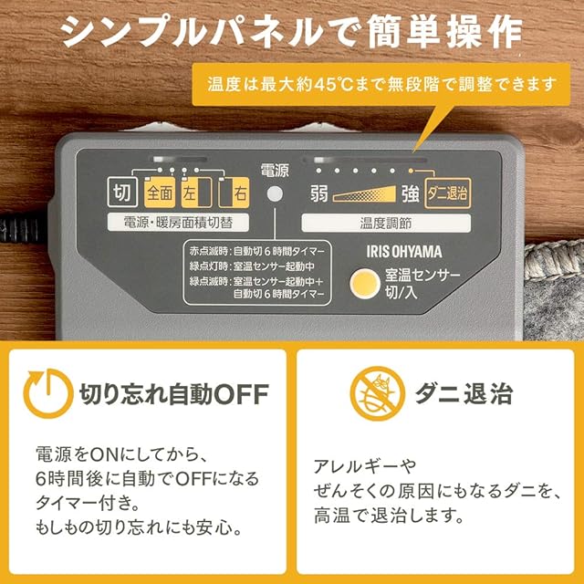 コード長さ:約1.5m●温度調節:無段階●暖房面積切替○(右、左、全面)●表面材質:ポリエステル100%●表面温度/消費電力/電気代(1時間当たり)・温度調節目盛 弱:約35℃/約215W/約5.8円・温度調節目盛 強:約45℃/約324W/約8.7円